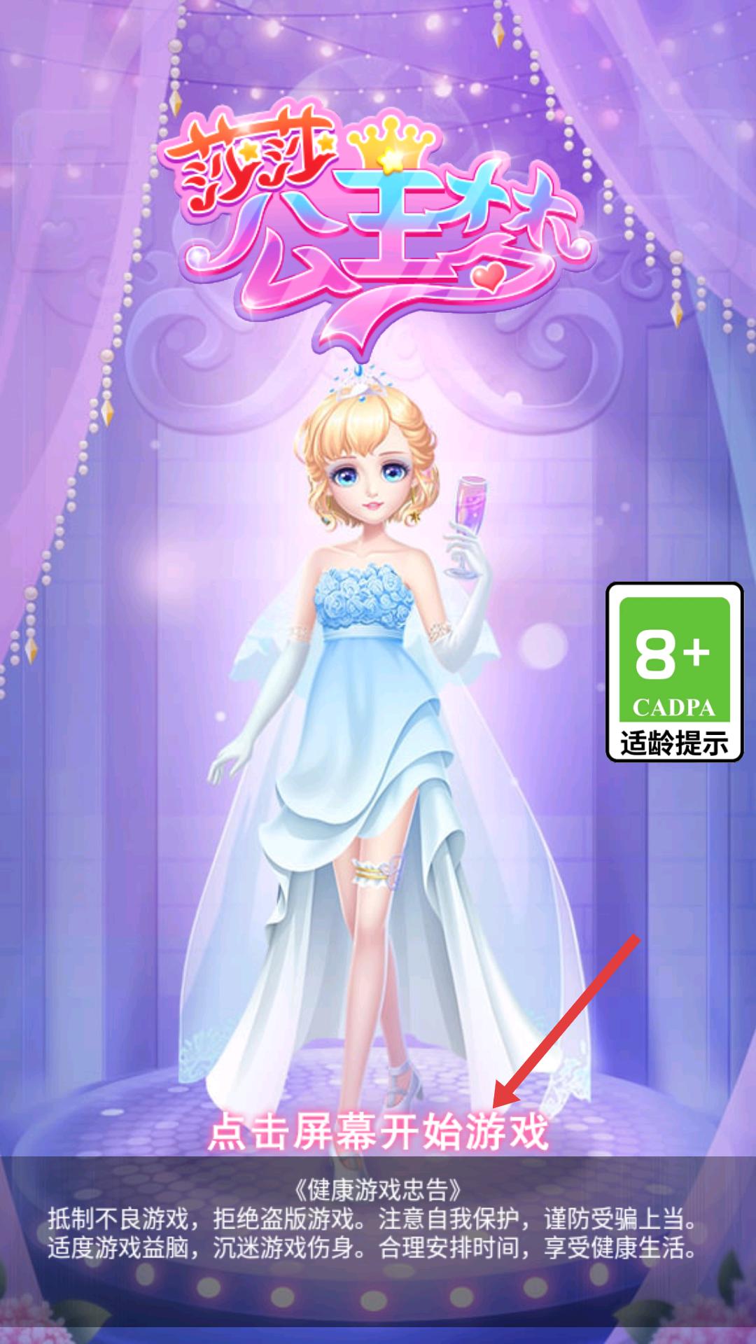 1、初始界面會看到點擊屏幕開始游戲的提示,點擊屏幕后,即可進入游戲世界,開啟公主裝扮等精彩玩法。