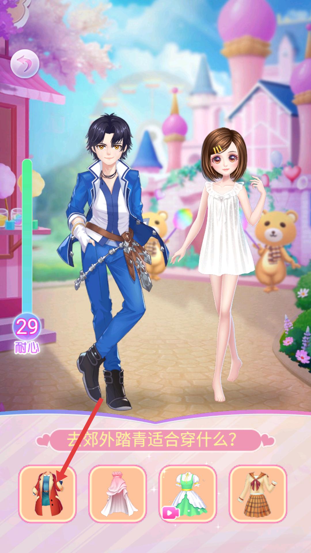 4、在穿搭選擇環節,遇到問題,可根據場景和服飾特點,選擇左側的紅色外套,這樣的選擇能契合踏青的氛圍與需求。