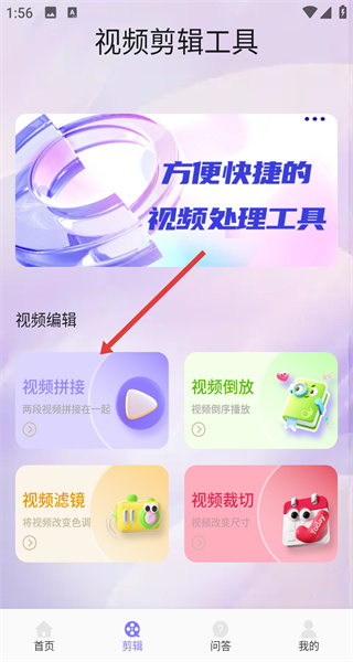 2、進入視頻剪輯工具頁面后,在視頻編輯區域找到視頻拼接功能選項,點擊它,準備進行視頻拼接操作。