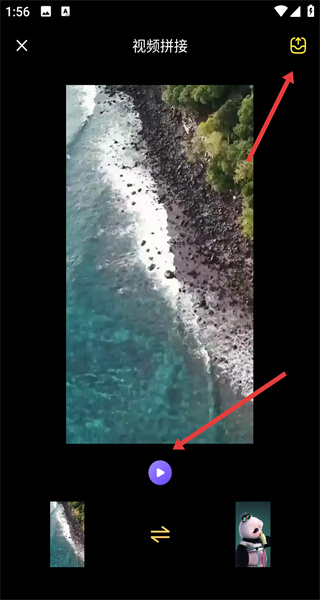 3、進入視頻拼接界面后,可看到待拼接的視頻內容,點擊界面中間的播放按鈕,能預覽拼接后的視頻效果,確認無誤后,點擊右上角的保存圖標。