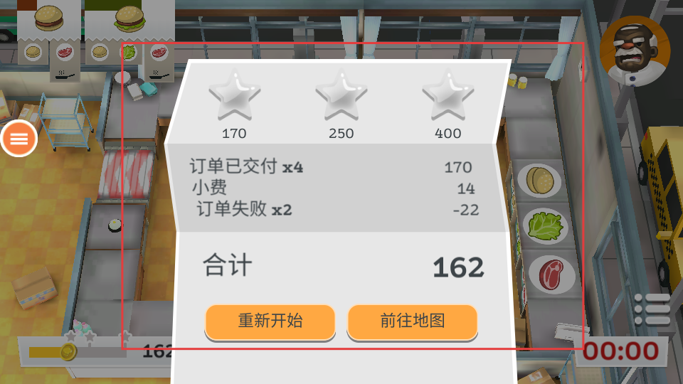 4、關卡結束后,會顯示訂單交付、小費和失敗等數據,根據合計分數,可選擇重新開始或前往地圖,繼續經營廚房。
