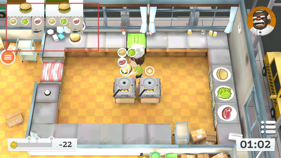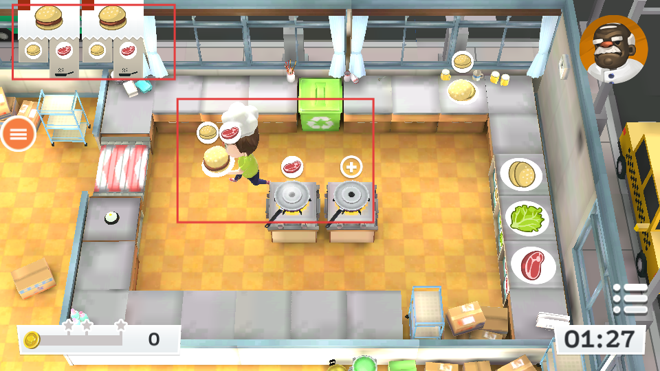 2、在廚房中根據訂單準備食材,操作廚師角色,在灶臺等區域烹飪,及時組裝漢堡,滿足顧客的訂單需求。
