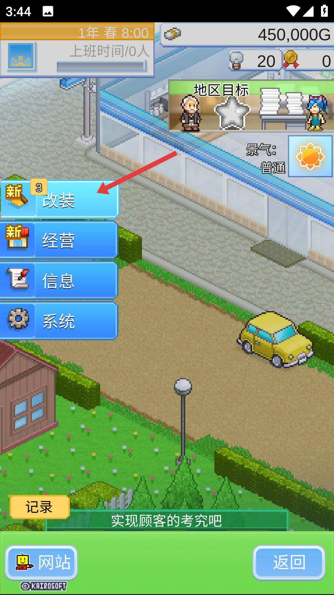 2、在主界面,點擊菜單按鈕,可打開菜單界面,從中選擇改裝、經營等功能選項,開展便利店的管理操作。
