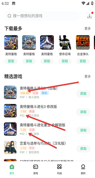 2、還可以瀏覽首頁下載最多精選游戲板塊,找到奧特曼格斗進化等游戲點擊獲取按鈕下載體驗。