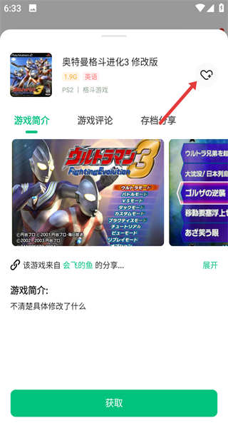 3、打開游戲詳情頁如奧特曼格斗進化3修改版,點擊右上角收藏圖標可以將該游戲添加到收藏列表。