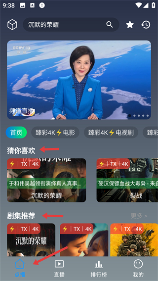 3、在點播首頁有猜你喜歡和劇集推薦板塊,可根據推薦發現感興趣的內容也可通過搜索框查找特定影視。