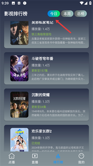 2、查看影視排行榜時可切換今日、本周、總榜了解不同時段熱門影視,如吳邪私家筆記等選擇喜歡的觀看。