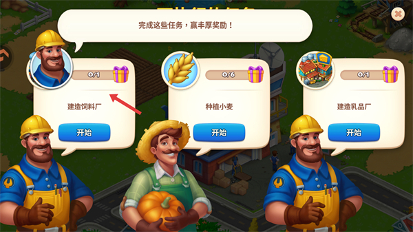 1、完成建造飼料廠、種植小麥、建造乳品廠等任務可獲得豐厚獎勵,點擊開始逐步完成任務提升農場設施和資源。
