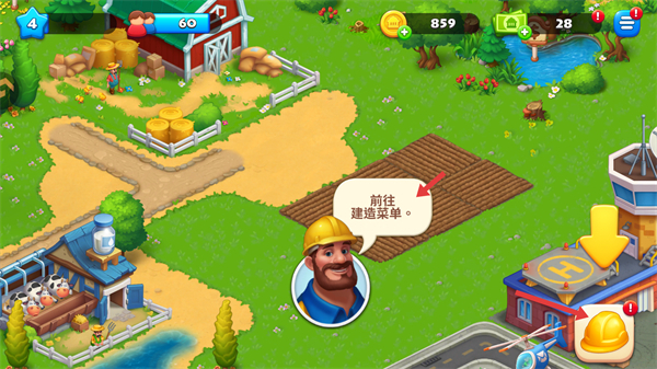 2、按照提示前往建造菜單規劃農場建筑布局,合理利用土地為后續建造飼料廠等設施做準備。