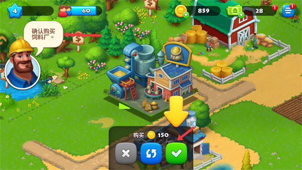 3、確認購買飼料廠花費150金幣建造,完成后可生產飼料助力養殖動物推動農場發展。