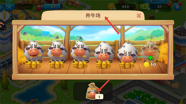 4、在養牛場利用飼料喂養奶牛每頭奶牛喂食后可產生資源,同時可花費金幣增加奶牛數量提升產奶效率。