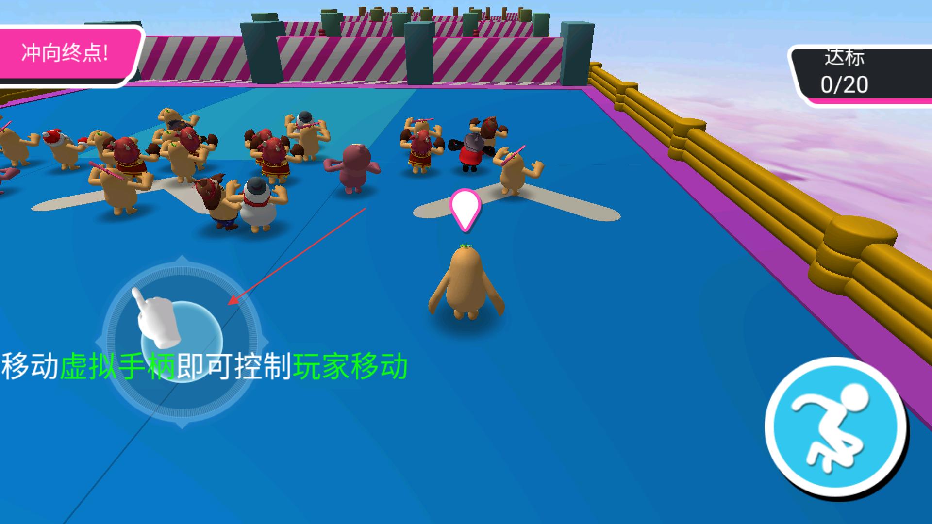 2、在比賽關卡中看到移動虛擬手柄控制玩家移動的提示,操控虛擬手柄,讓角色在賽道上移動,朝著比賽目標行進。