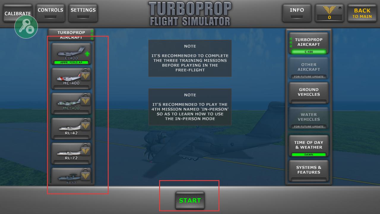 1、游戲可選擇C400等多種渦輪螺旋槳飛機,還能設置時間天氣等,選擇好后點擊START即可開啟飛行。