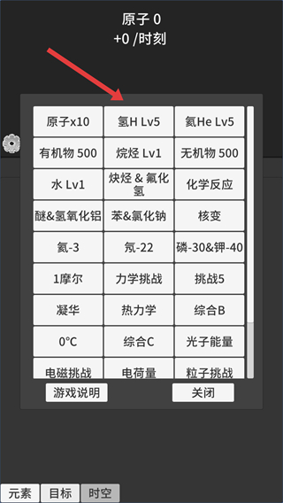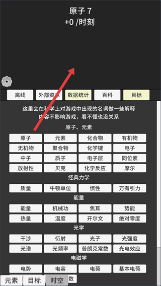 4、進入百科界面學習原子、元素、化合物等化學和物理名詞的解釋,在游戲過程中積累科學知識,提升對微觀世界的認知。