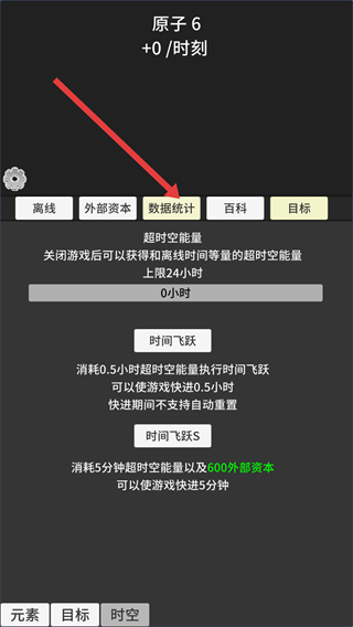 3、在數據統計界面查看超時空能量等資源的積累情況,利用時間飛躍功能快速推進游戲進程,合理管理資源以加速原子和元素的發展。