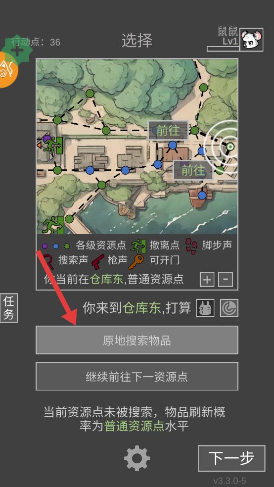 2、進入資源點后,可選擇原地搜索物品,搜索能獲取各類資源,需合理利用行動點,在資源點進行搜索操作以積累物資。