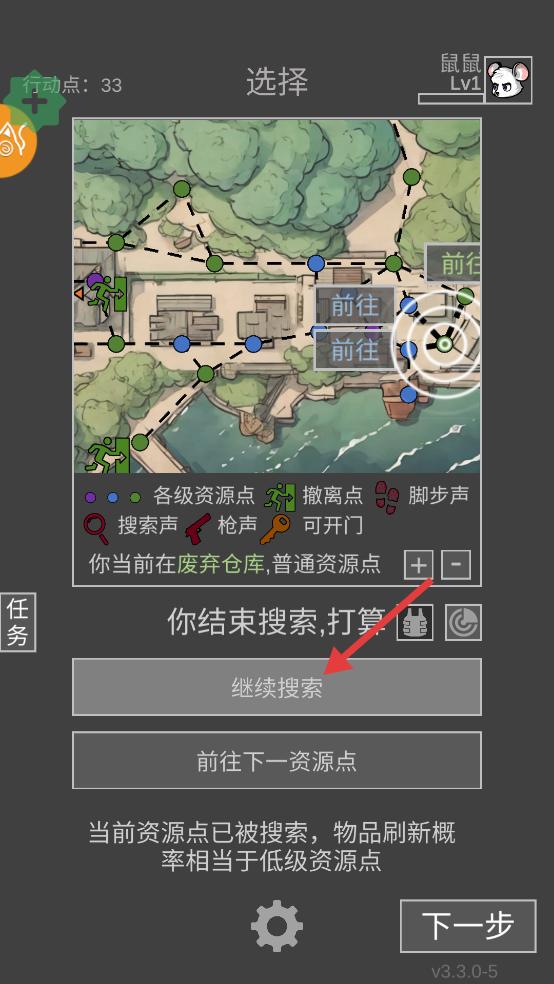 4、在一個資源點搜索結束后,可選擇繼續搜索或前往下一資源點,繼續搜索可在當前資源點獲取更多物品,需根據物品刷新概率和行動點合理選擇。