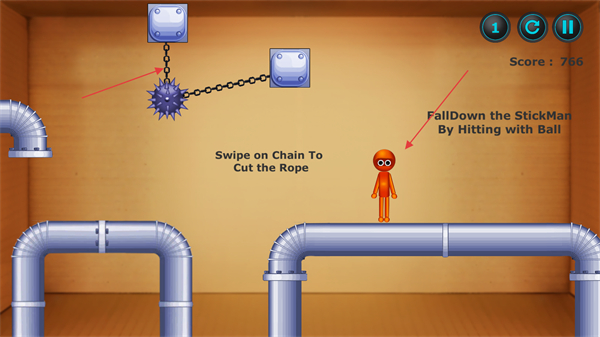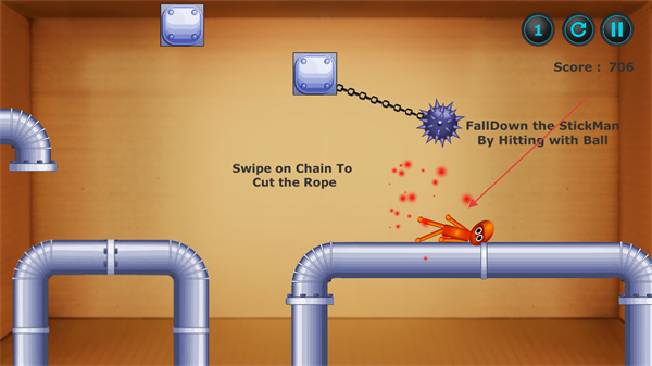 2、滑動鏈條切斷繩索,使帶刺球等機關下落,精準攻擊管道上的木偶人,使其掉落完成關卡目標。