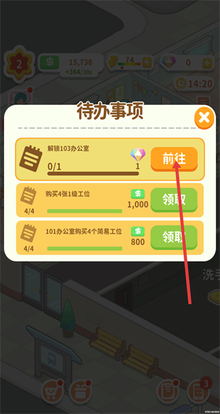 1、查看待辦事項點擊解鎖103辦公室旁的前往,跟進新辦公區域解鎖任務,按指引推進拓展物業公司布局。