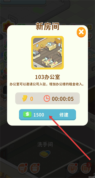 2、進入103辦公室修建界面耗1500金幣點擊修建,等待倒計時結束解鎖新辦公空間為引入公司奠基。