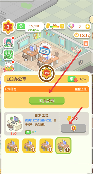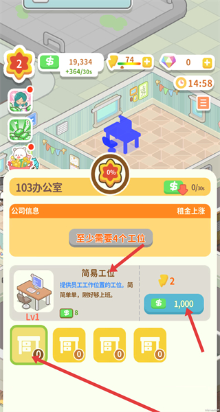 3、103辦公室需4個工位點擊簡易工位旁的1000按鈕花費金幣購置,裝修公司逐步滿足工位數量要求提升辦公容量。