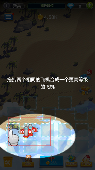 2、拖拽兩個相同等級的飛機進行合成,升級為更高等級的飛機,提升飛機的戰斗力和攻擊效果,增強防御能力。