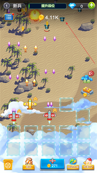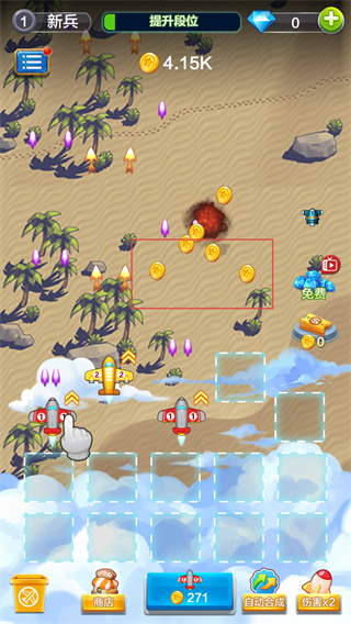 3、從新兵段位開始不斷挑戰關卡,通過合成高級飛機、高效收集資源來提升段位,體驗從基礎防御到強力塔防的成長過程。