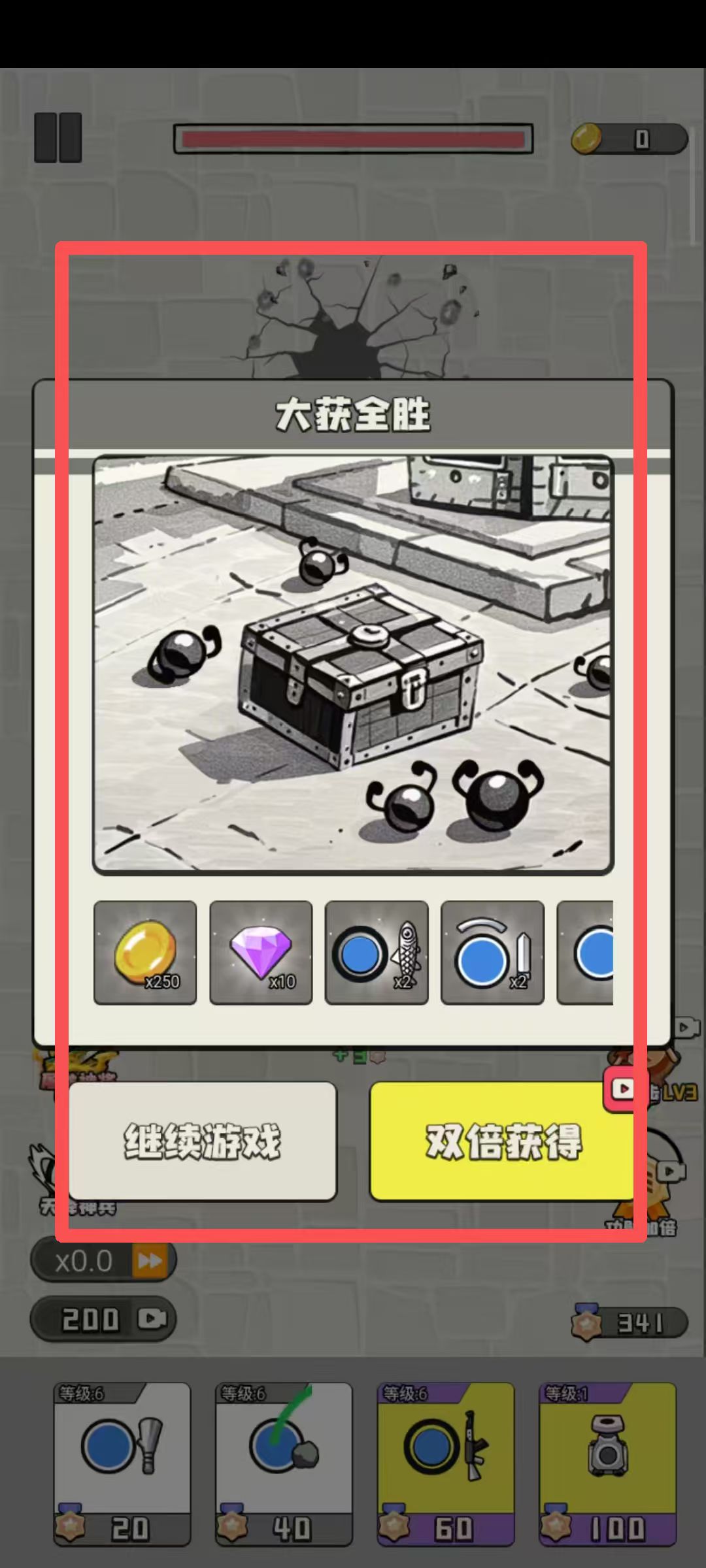 4、戰斗勝利后會彈出大獲全勝界面,可選擇繼續游戲或雙倍獲得獎勵,獲取的金幣、鉆石等資源可用于后續關卡的戰斗準備。