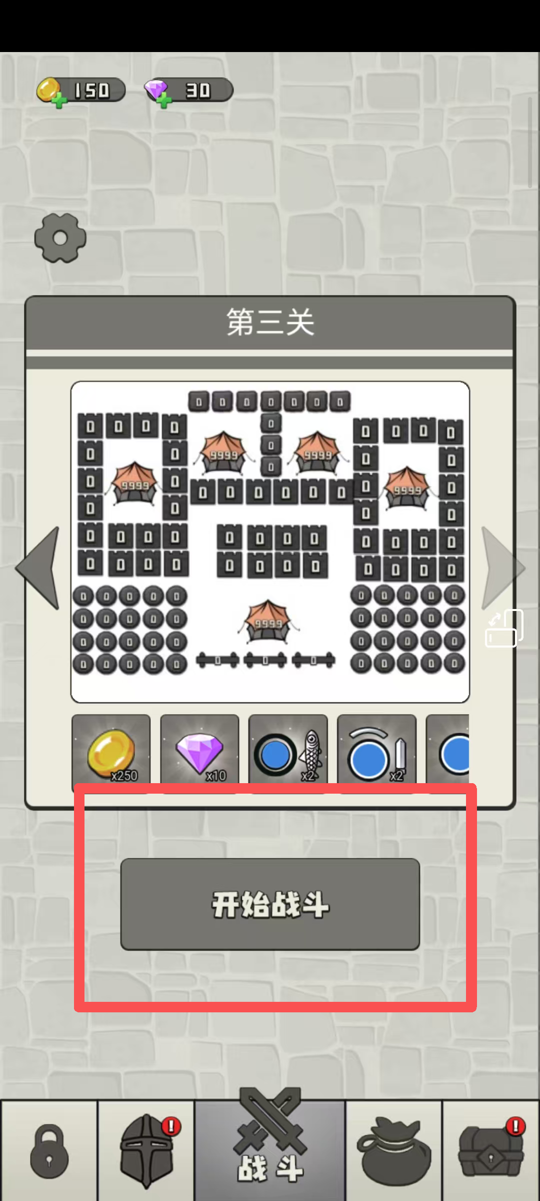 1、點擊開始戰斗按鈕進入關卡,關卡界面有不同數字的方塊和帳篷,需規劃戰斗策略,利用資源推進戰斗進程。