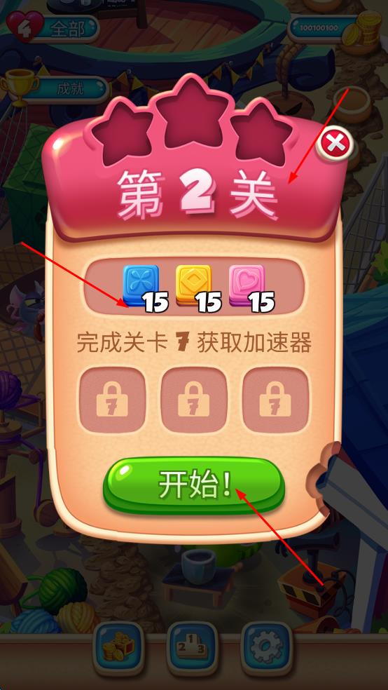 1、選擇相對應關卡,確認目標方塊數量,點開始進入關卡,準備消除對應顏色方塊。