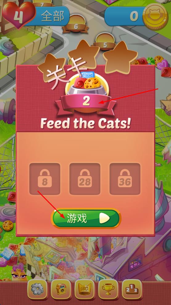 1、進入關卡選擇界面,點擊關卡選擇需要的道具,點擊綠色游戲按鈕,開啟喂貓消除挑戰。