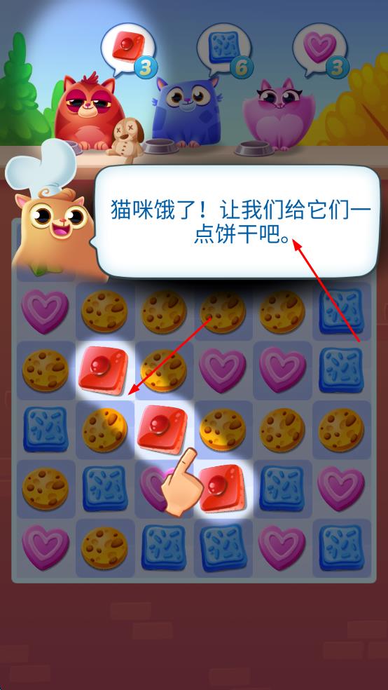 3、根據提示,拖動連接紅色方塊餅干,完成消除,為貓咪準備食物,推進關卡進度。