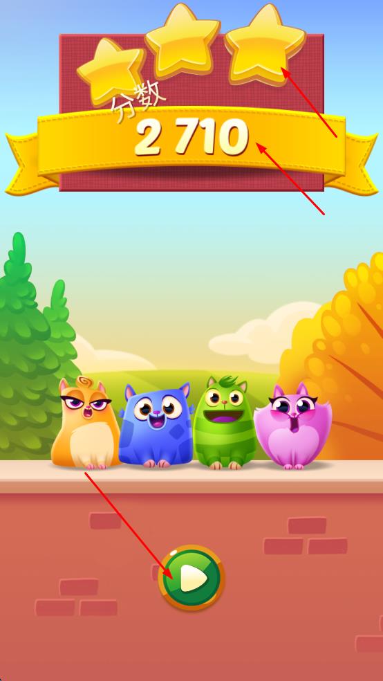 4、關卡結束后,查看分數與星級,點擊綠色按鈕,可進入下一關繼續喂貓消除。