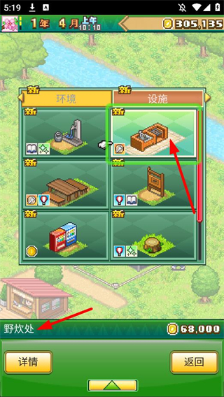 1、在設施界面選擇野炊處,花費對應金額,準備在露營地內布置該功能設施,豐富營地的服務項目。