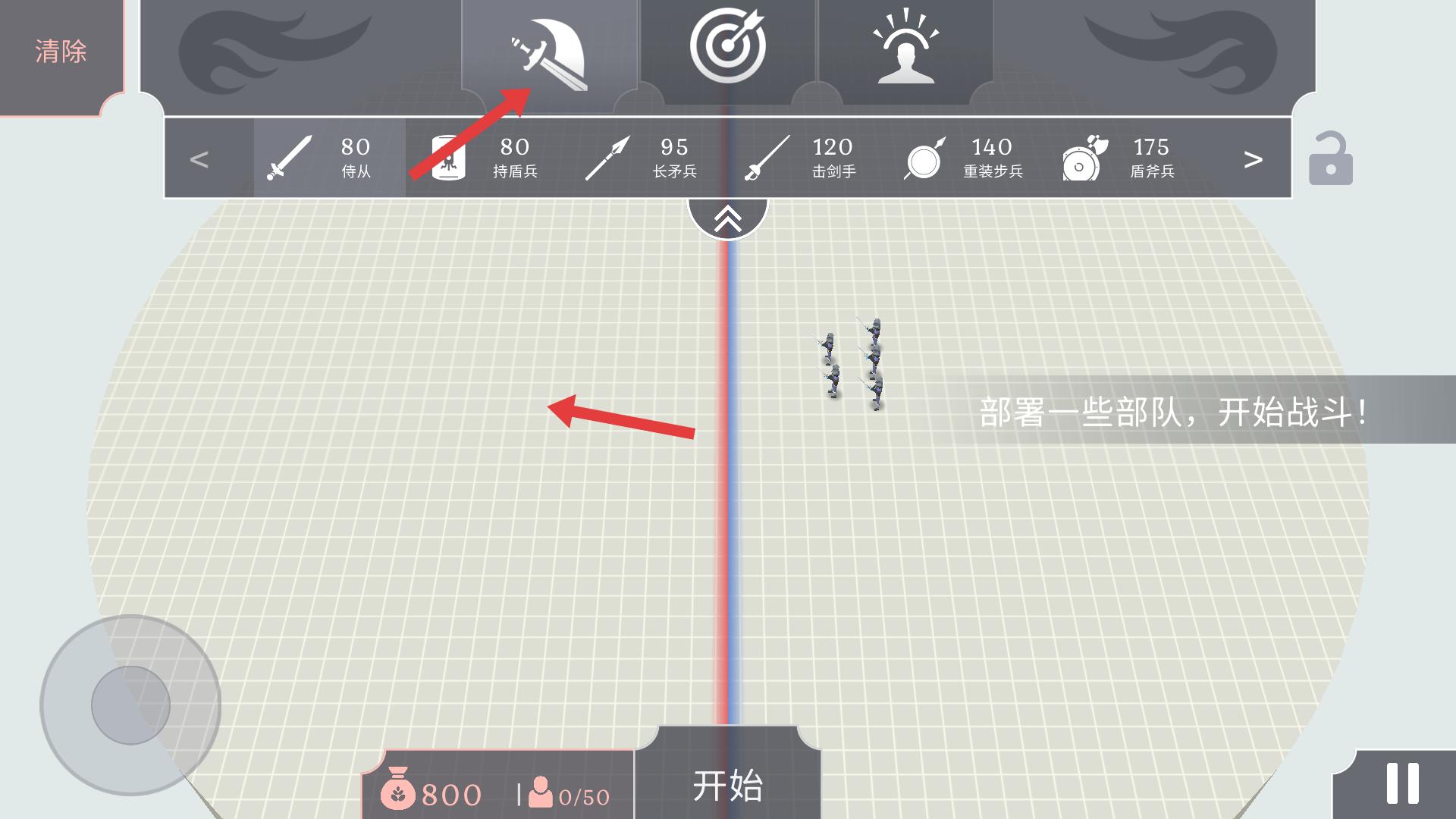 2、在戰斗部署界面,上方有侍從,持盾兵等不同兵種可選,點擊兵種后在左側區域部署,準備與敵方部隊作戰。