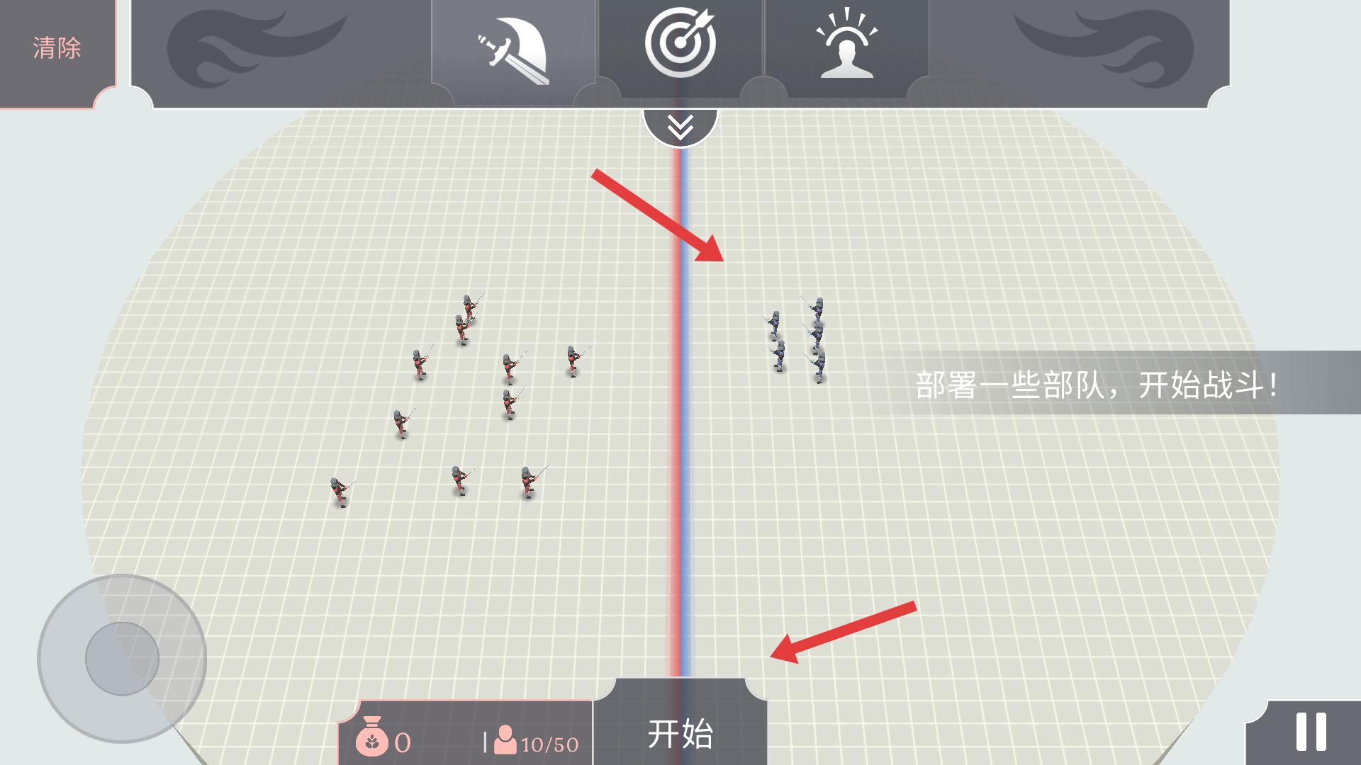 3、部署好兵種后,點擊開始按鈕,己方與敵方部隊將展開戰斗,過程中需關注雙方兵力變化,直至一方部隊被擊敗。