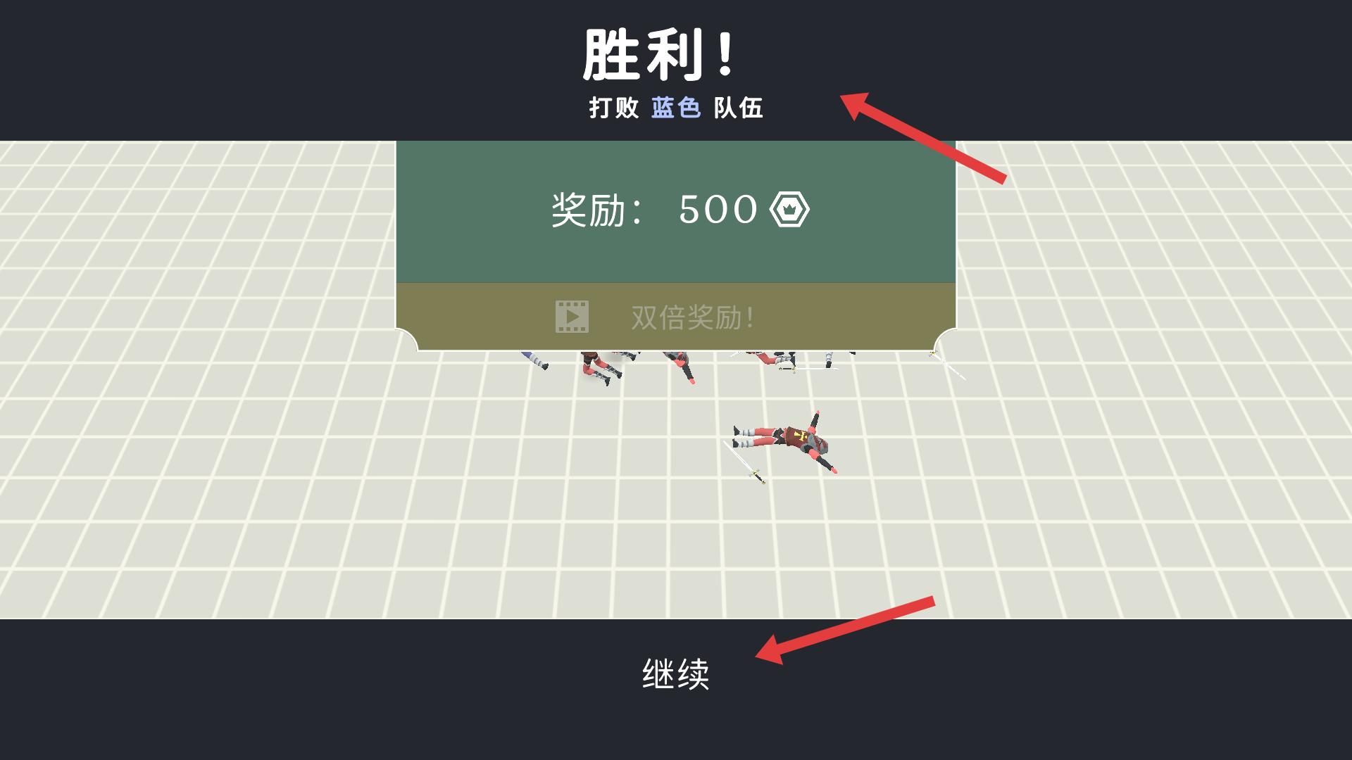 4、若己方部隊擊敗藍色隊伍,會出現勝利界面,顯示獎勵500六邊形貨幣,點擊繼續可進入下一場戰斗或返回界面。