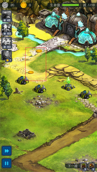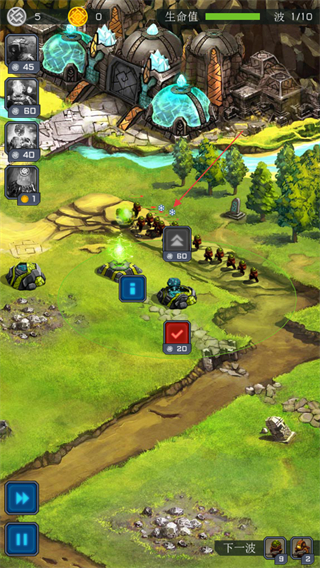 2、在地圖的空格區域部署不同類型的防御塔,根據敵人的行進路線和類型,合理布局塔防建筑,構建防御陣線。