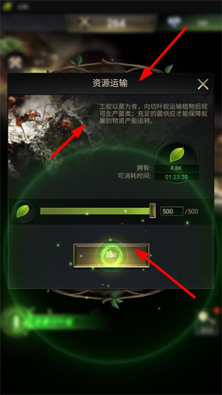 1、在資源運輸界面,了解工蟻可運輸資源,查看現有綠葉數量,確認可消耗時間后,點擊運輸按鈕,即可完成資源的調度操作。