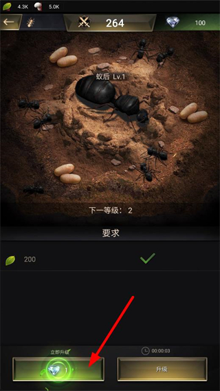 3、查看蟻后界面顯示等級為1,滿足200綠葉要求后,可選擇花費鉆石立即升級,或等待時間,提升蟻后等級助力蟻群發展。