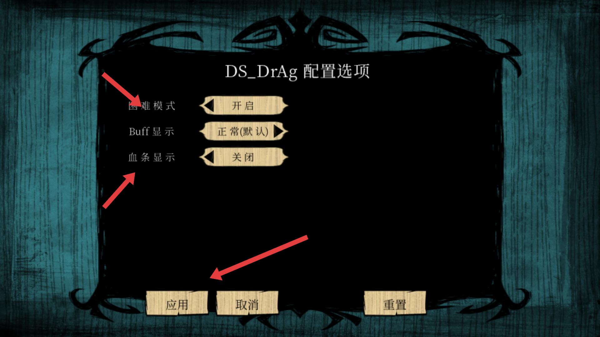 3、在配置選項,可調整困難模式、Buff顯示、血條顯示等設置,調整后點擊應用按鈕保存更改,讓游戲玩法更契合自身需求。
