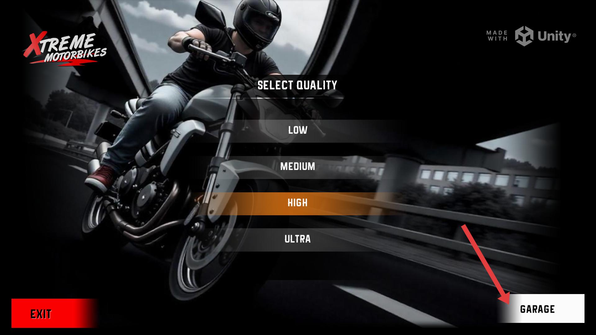 1、在游戲界面,選擇后點擊右下角GARAGE按鈕,進入游戲場景開始摩托車騎行之旅。