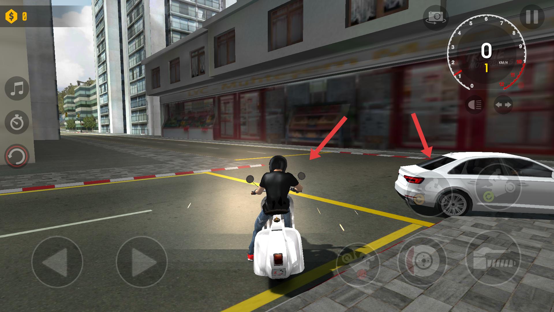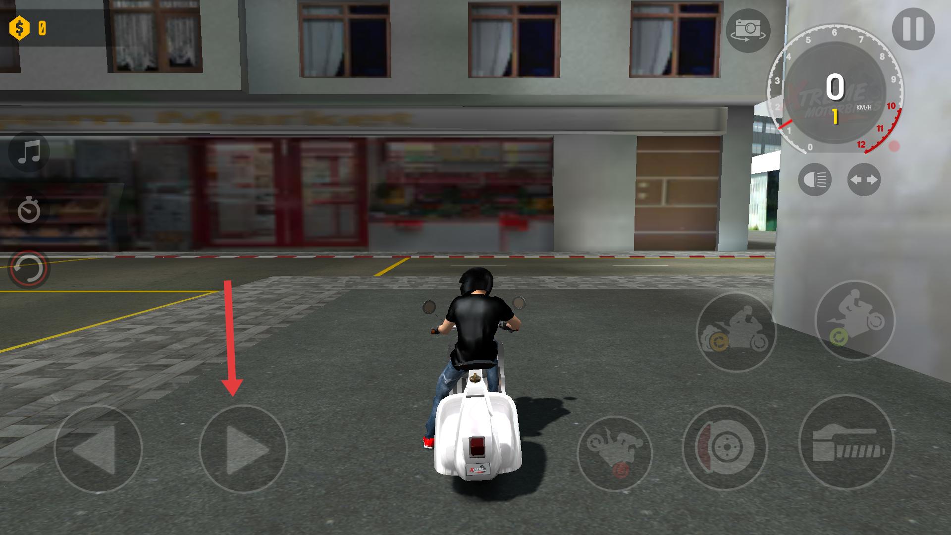 2、在游戲騎行界面,左下角的前進按鈕可控制摩托車加速前進,合理操作該按鈕可讓摩托車在城市道路上行駛,開啟騎行探索。