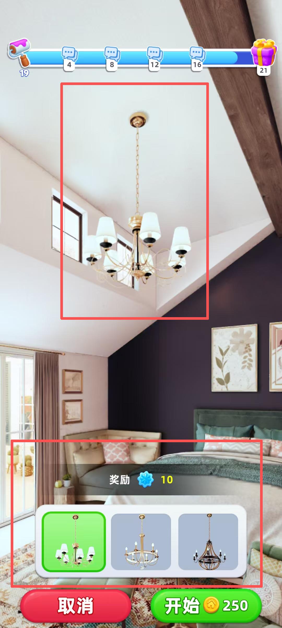 3、還可以選擇不同的你喜歡的吊燈樣式進行安裝,完成后可獲得10獎勵,提升房間的美觀度。