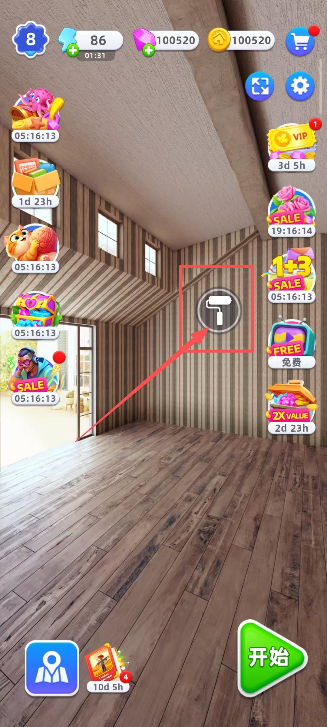 2、點擊圖片中粉刷的標致,使用粉刷工具對房間墻面進行粉刷,改變墻面風格,讓房間煥然一新。