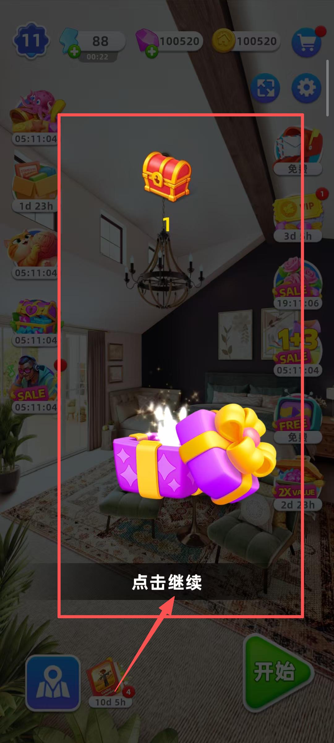 4、完成裝修任務后,點擊繼續按鈕,領取寶箱和禮物獎勵,繼續進行其他房間的裝修。