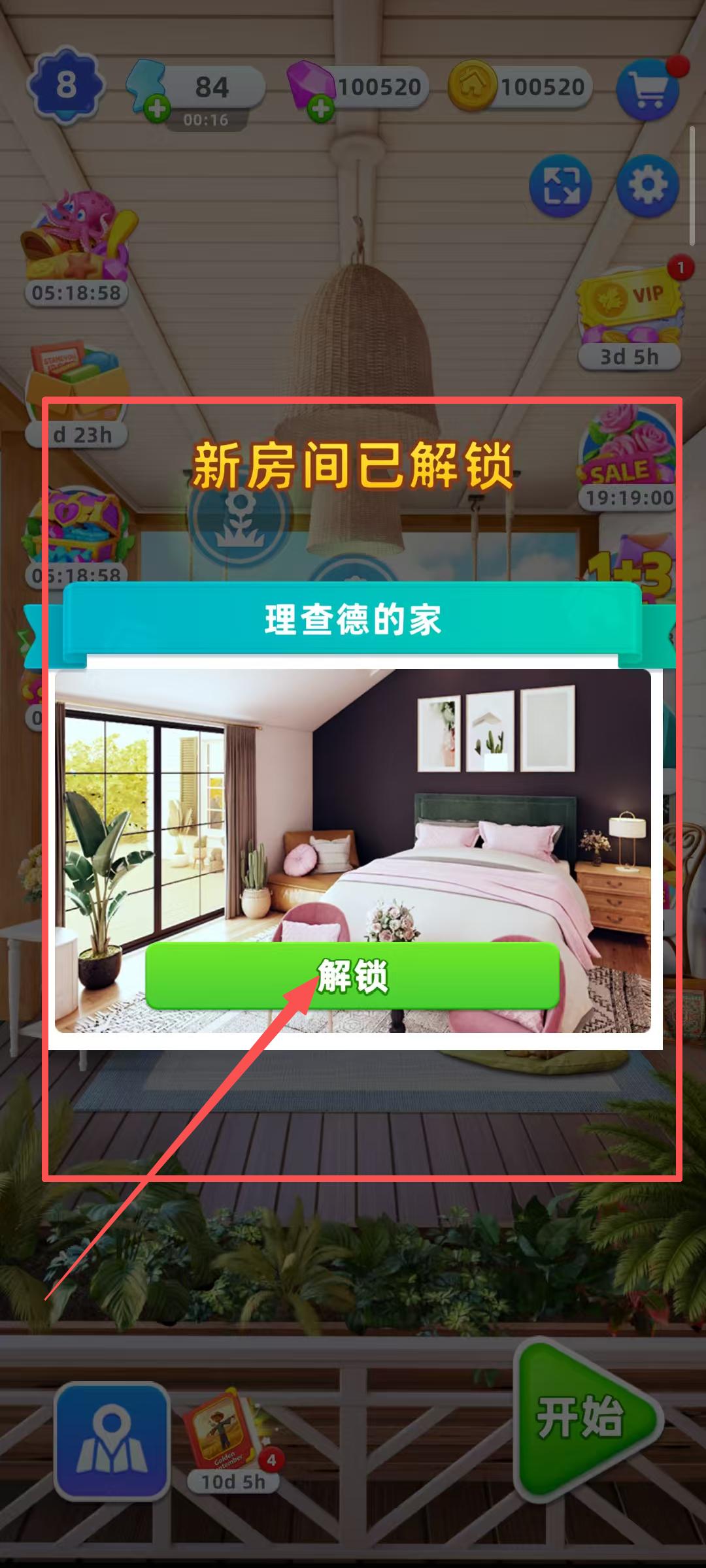 1、點擊解鎖按鈕,開啟新房間理查德的家,解鎖后可對房間進行裝修,推進游戲進程。