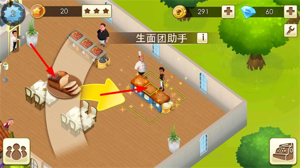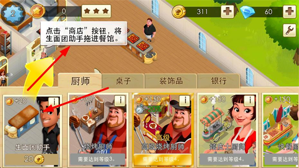 1、點擊商店按鈕,選擇生面團助手并拖入餐館,解鎖對應的輔助角色,助力餐廳的食材準備流程。