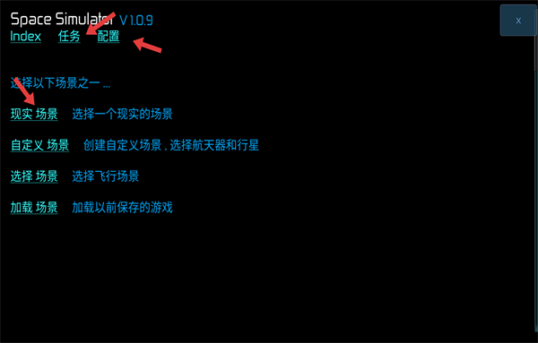 1、選擇現實場景進入SpaceSimulator游戲的現實航天場景,開啟航天模擬之旅先熟悉場景選擇界面的功能。