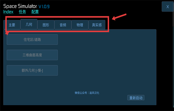 2、進入配置界面調整主要幾何等各項設置,優化游戲體驗為航天模擬操作做好準備。